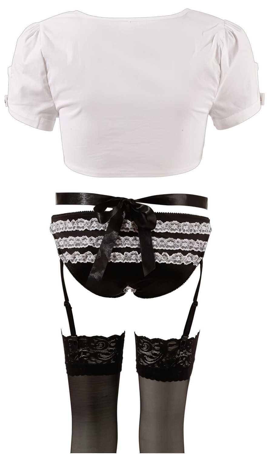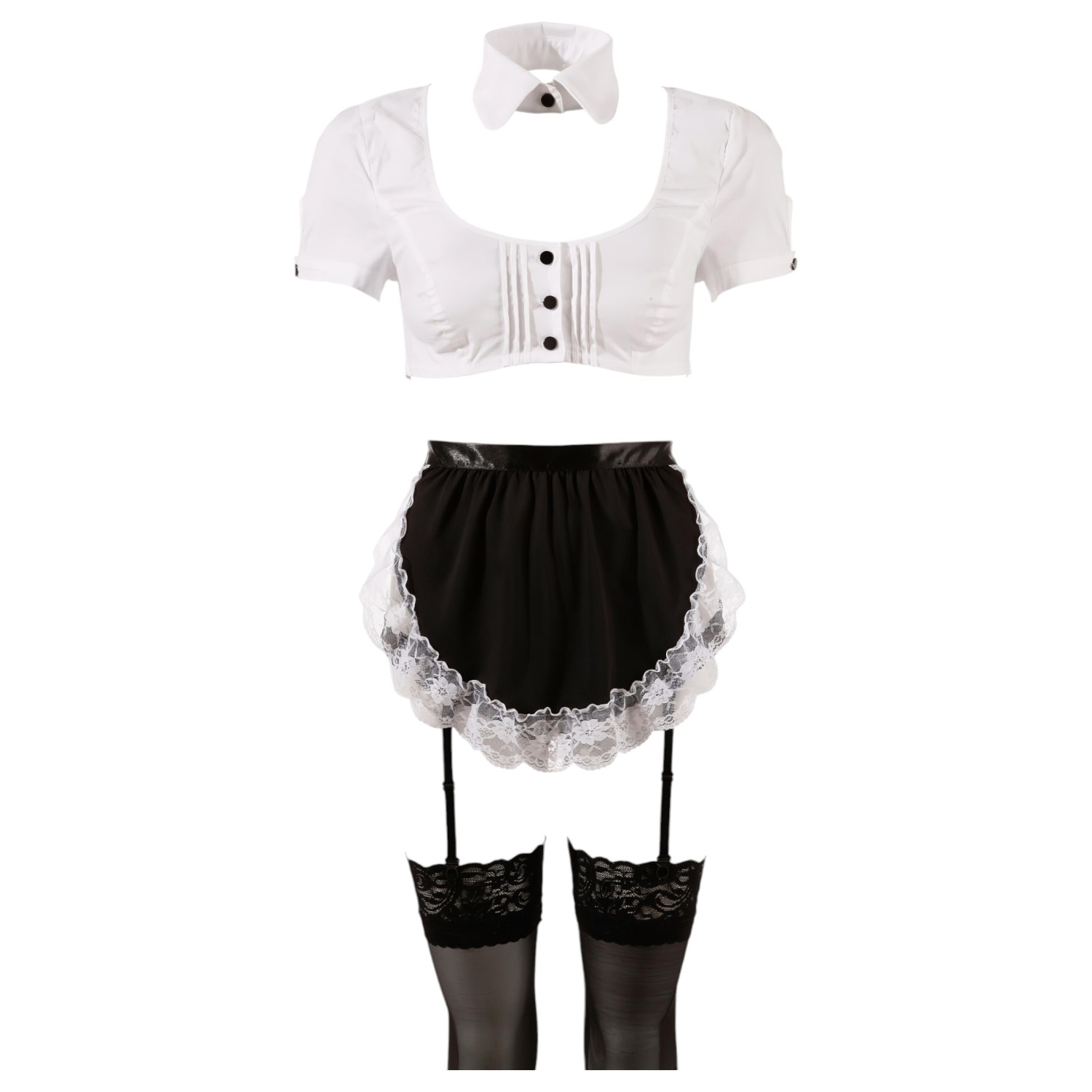 • Crne čipkaste čarape, bijeli ovratnik s gumbima, kapica s trakicom za kosu i pregača s bijelom čipkom i crnim satenskim pojasom - sve što ti treba za potpuni doživljaj u igri uloga.