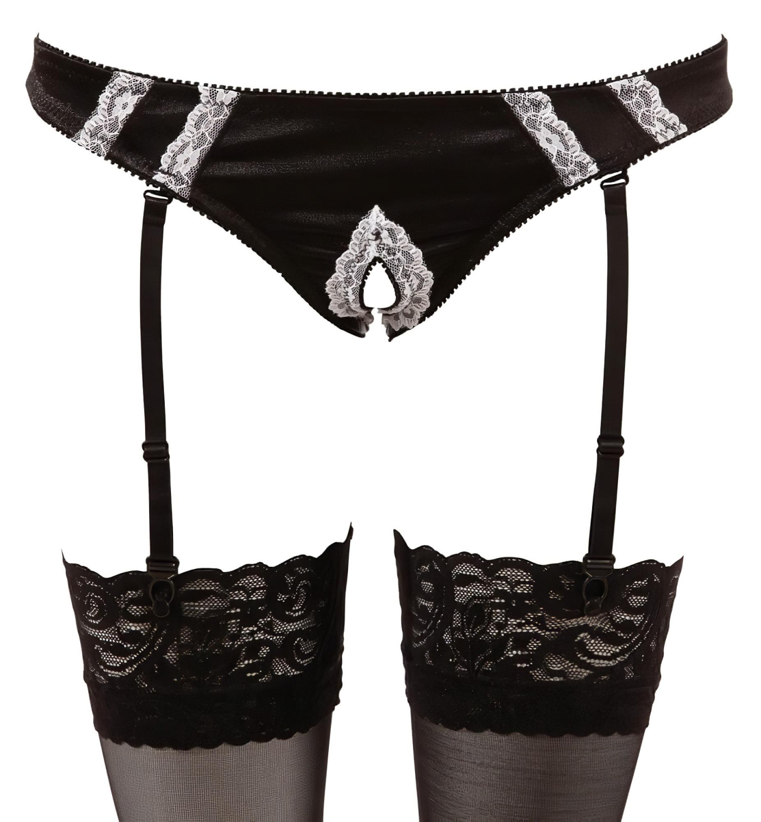 • 1x crne satenske gaćice s halterima, volanima i bijelom čipkom, otvorene u međunožju